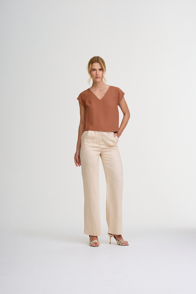 Descrição: Blusa com decote em V e mangas curtas. Modelagem reta, levemente solta ao corpo, garante caimento sofisticado e leveza.