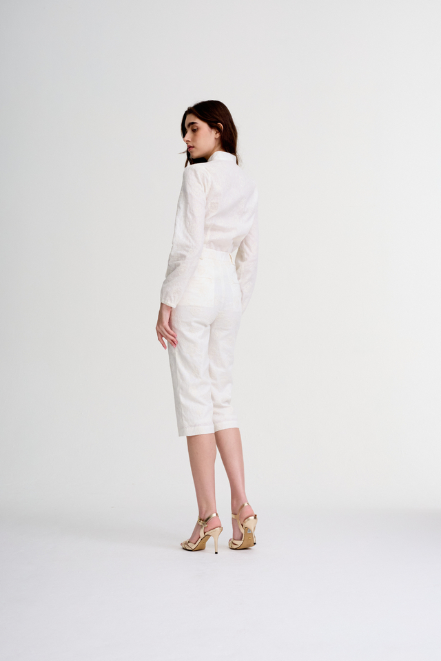 Modelagem de cintura alta, desenhada para alongar o corpo. Possui pregas frontais, passantes largos e fechamento com zíper e botão forrado. Comprimento midi (logo abaixo do joelho), confere um ar contemporâneo e elegante. Caimento reto e levemente ajustado ao corpo.