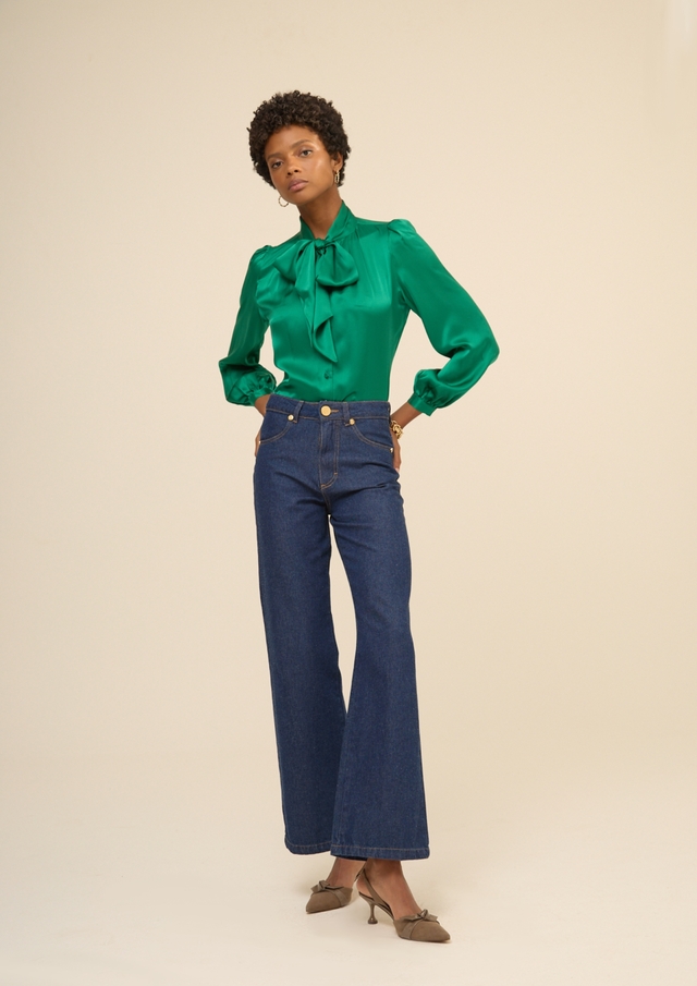 Calça jeans confeccionada em algodão. A peça possui bolsos na parte frontal e na parte de trás, altura no centro do corpo, fechamento tradicional de jeans com botão personalizado e caimento reto.
