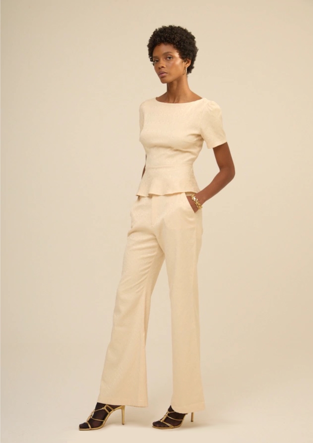 Calça na cor creme confeccionado em jacquard. A peça possui corte levemente flare e fechamento por zíper e botão.