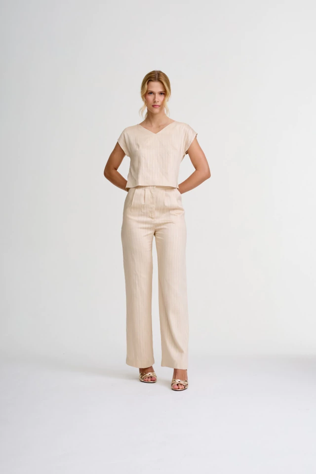 Calça de cintura alta com caimento reto e alongado. Confeccionada em seda e visose, traz leveza, frescor e movimento. A modelagem valoriza a silhueta, com linhas limpas e sofisticadas.