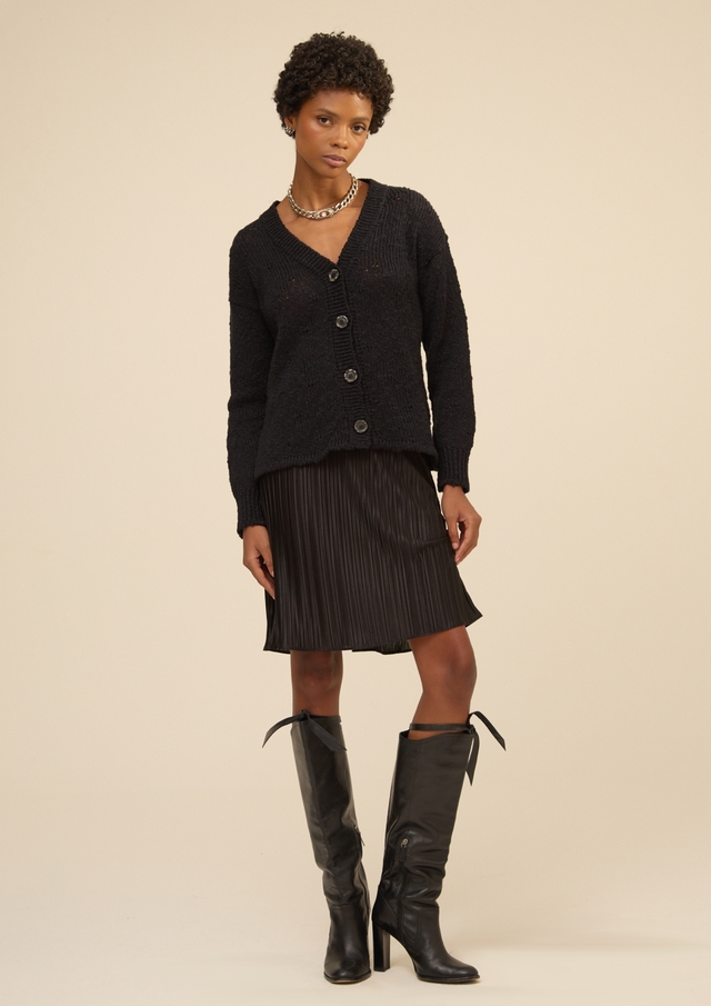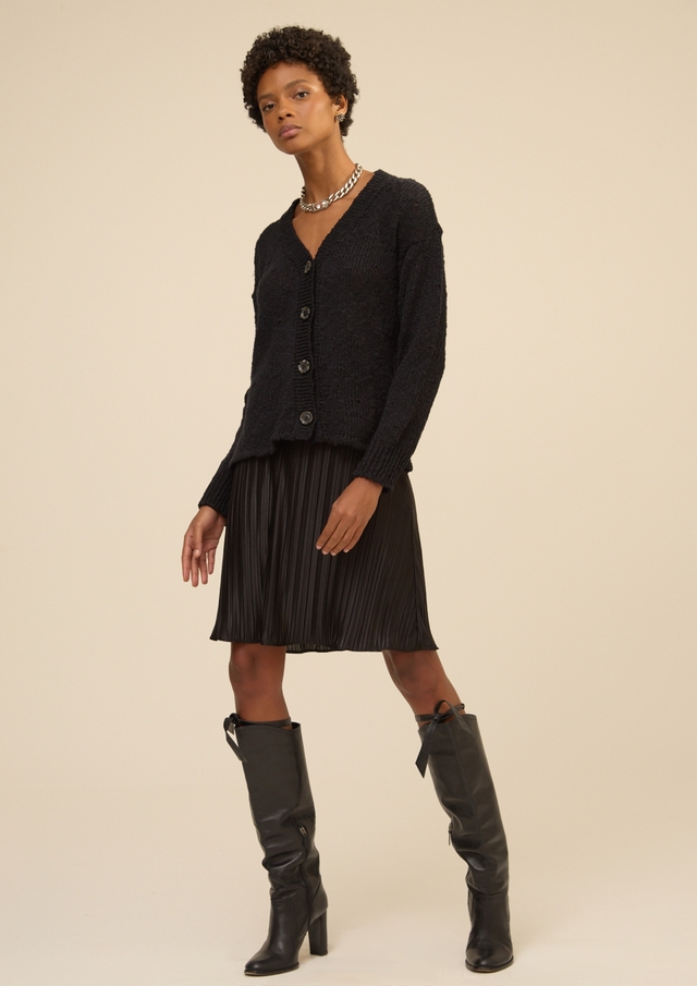 Saia plissada na cor preta. A peça possui comprimento acima do joelho, shape reto, cintura alta e fechamento por zíper.