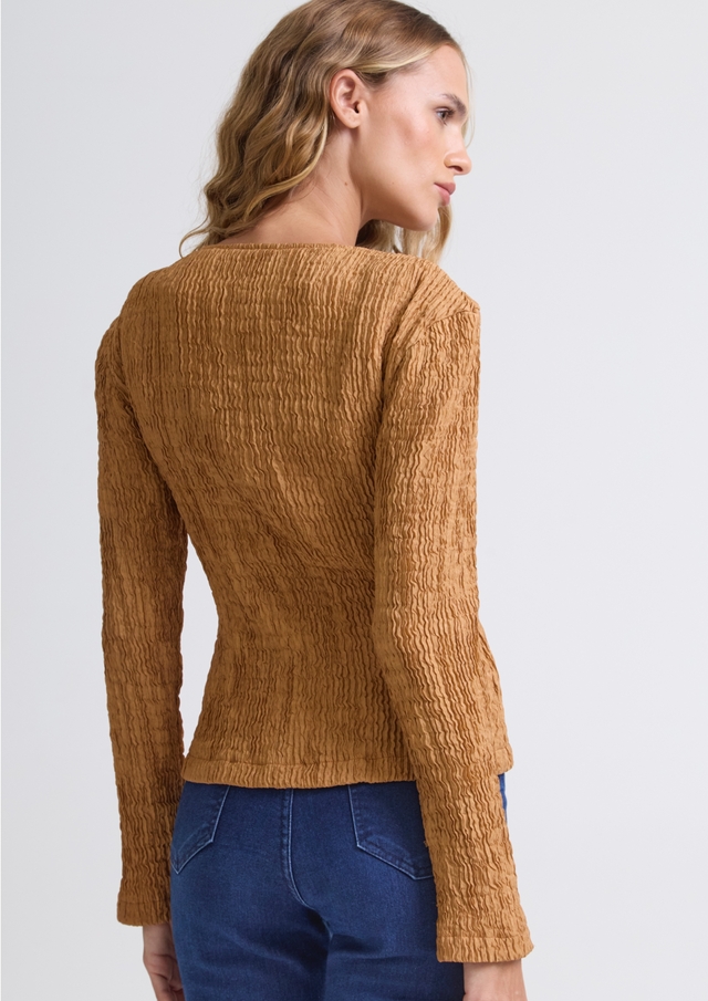 Conjunto composto por blusa e casaquinho, confeccionados em um tecido texturizado de alta qualidade.